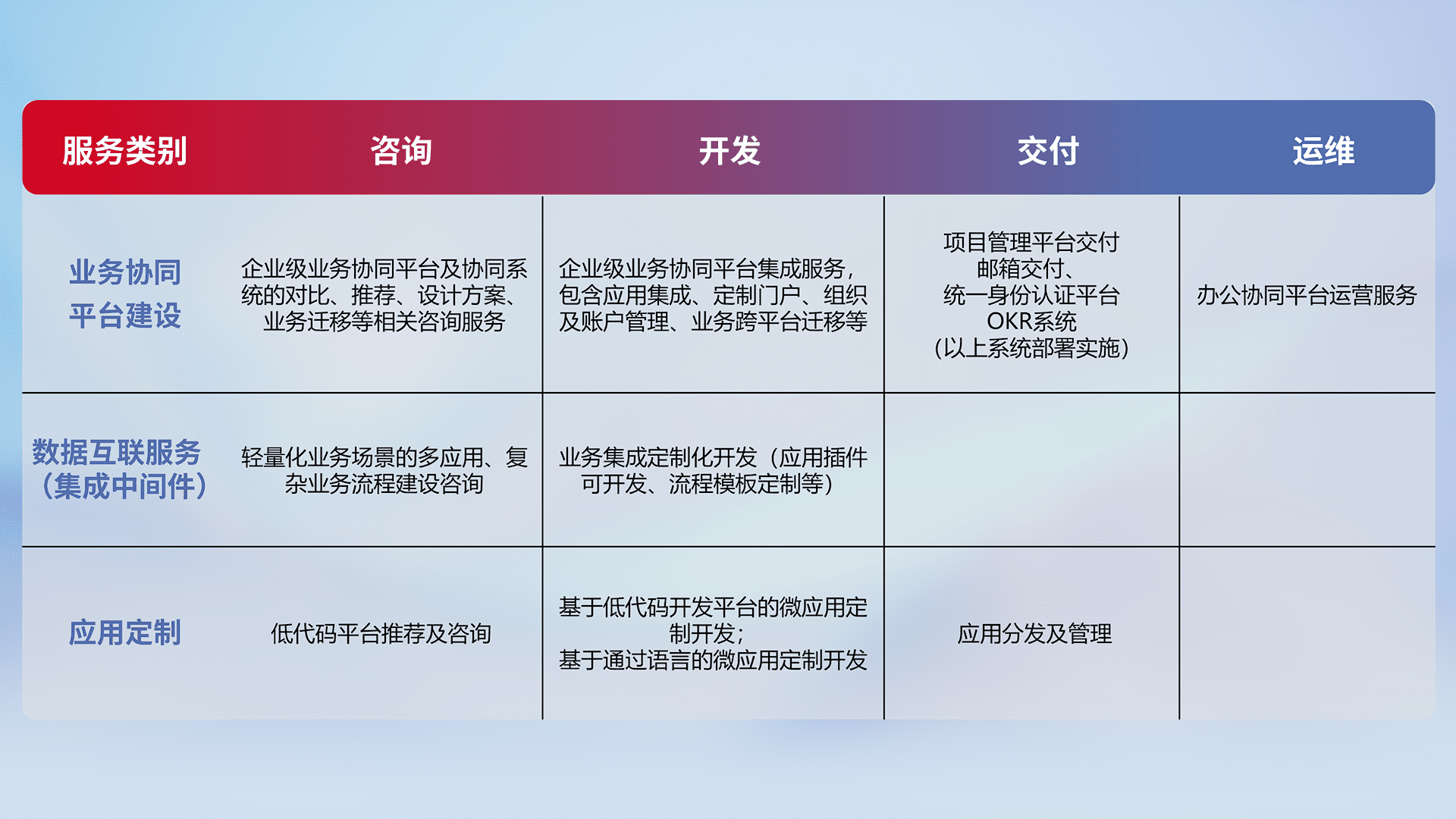 针对钉钉、、企微、、、、IDaas等平台级产品提供产品的规划、、、、方案、、、交付、、、定制化开发等服务,,,实现如统一协同办公、、、智能客户服务、、混合会议管理、、、智能数据查询、、、等业务场景,,实现数字化转型。。。